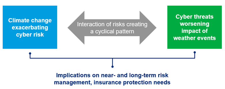 As global interconnectivity and reliance on technology expand, the need for data centers and digital infrastructure rises, which consumes more energy and water for cooling, thus contributing to climate risk. Similarly, by posing a threat to the physical infrastructure of those digital assets, climate events enhance cyber vulnerability, creating a cyclical feedback loop of risk.