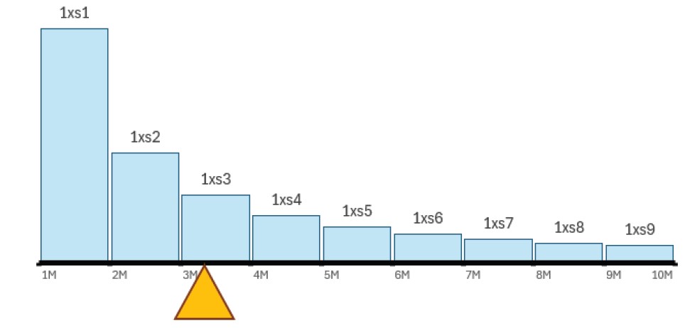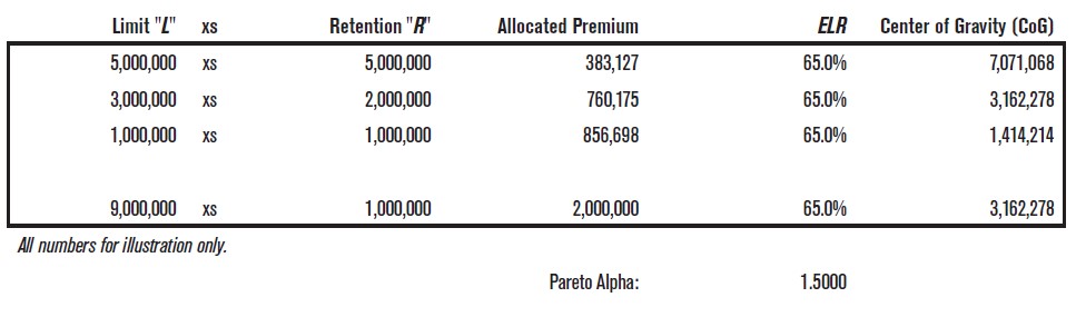 The idea is to find a weighted average midpoint of the collection of policies. We can think of breaking the tower of layers more finely than even the three layers identified above; perhaps with a series of 1,000,000 limits in a tower. If we allocate premium to each of these smaller layers, we can then average the midpoint of each small layer by the allocated premium to get an overall CoG for the tower.