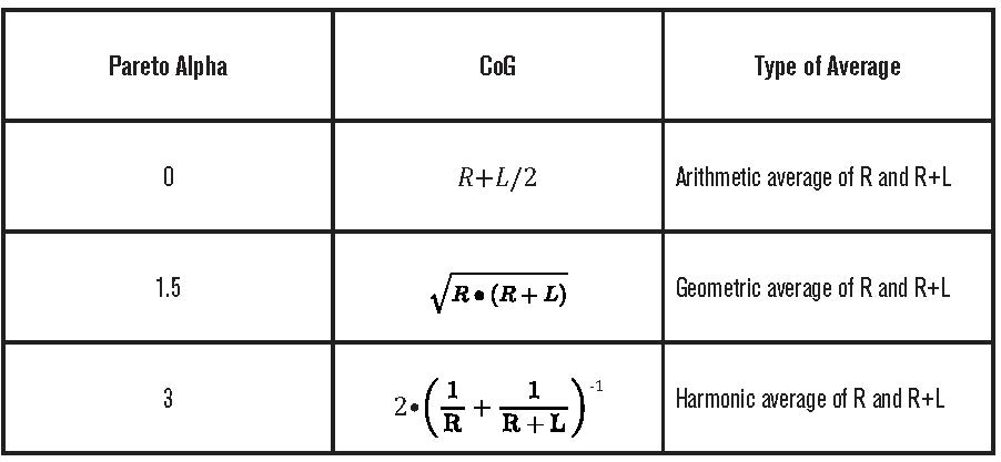 A useful special case is the Pareto with shape parameter alpha equal to 1.500. The CoG is equal to the geometric average of the retention and the upper limit (plafond). For example, a layer of 5,000,000 excess of 5,000,000 would use the square root of the product of 5,000,000 and 10,000,000: resulting in a CoG of 7,071,068. As the shape parameter moves towards zero, the CoG moves towards the midpoint of the layer.