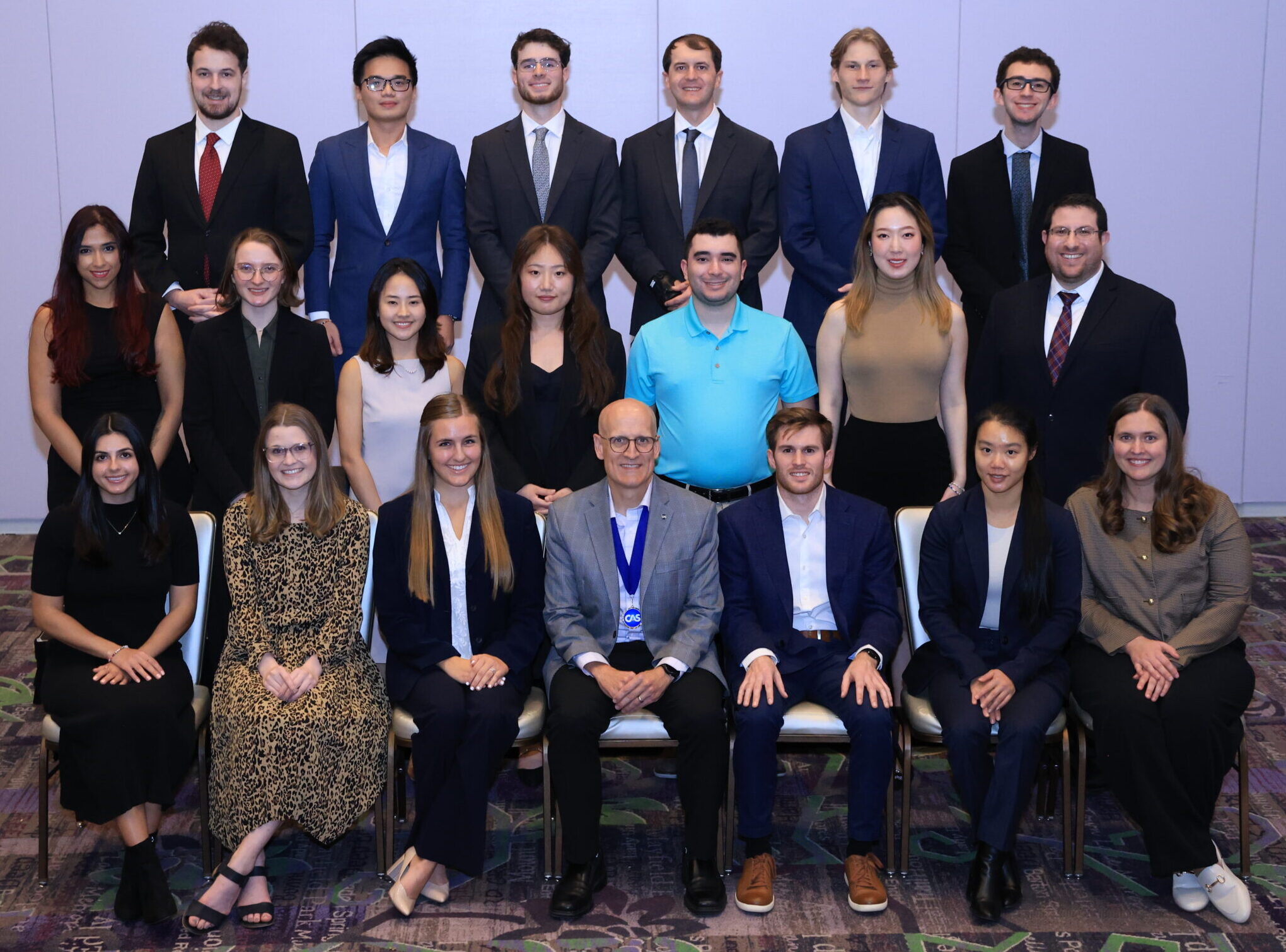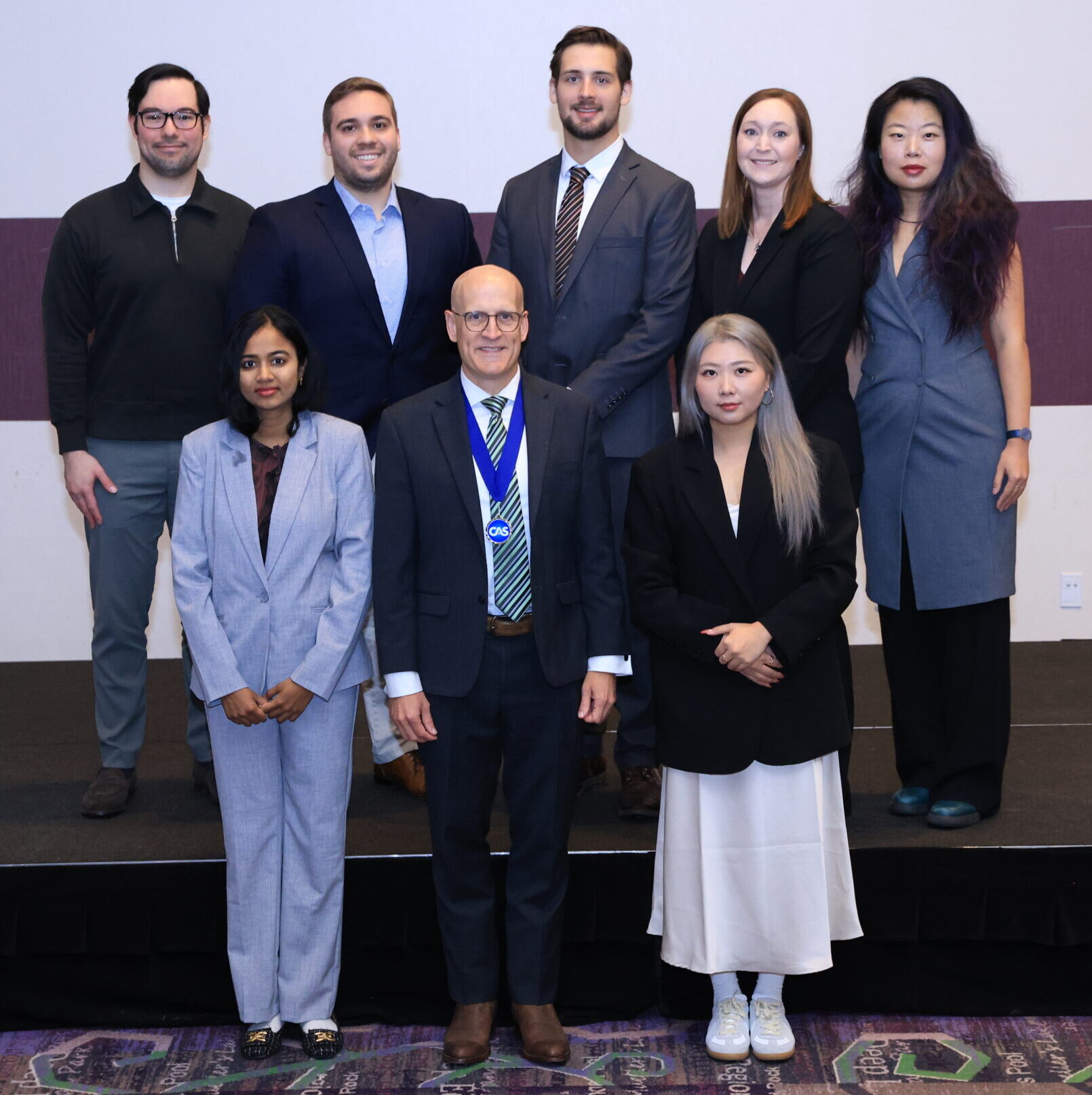 Row 1, left to right: Yuping Jiang, Vanessa Li, Sara Lawson, CAS President David Cummings, Bob McCarthy, Anastasia Yiasoumi, Benjamin Flisakowski.