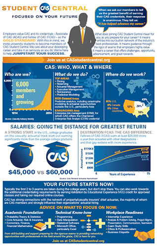 Launched in January 2014, CAS Student Central serves the growing number of college students pursuing property-casualty careers. The program has seen enormous success in its first year, with more than 1,500 student members from over 300 universities. If you know a college student considering an actuarial career, we encourage you to share this infographic with them. The piece is available for download on the CAS Student Central website (www.casstudentcentral.org/infographic/), or a printed copy can be requested from the CAS office.